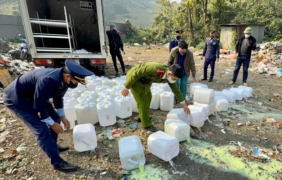 Lực lượng chức năng thu giữ và tiêu hủy rượu không nguồn gốc tại Lào Cai