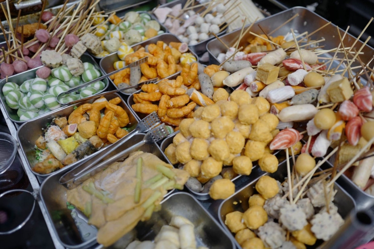 Các loại đồ xiên đủ màu sắc, hình dạng được đặt trong từng khay inox nhưng trên vỉa hè không có bất cứ màng bọc che chắn nào, đa phần đều chưa rã đông. (Ảnh minh họa: Linh Trang)