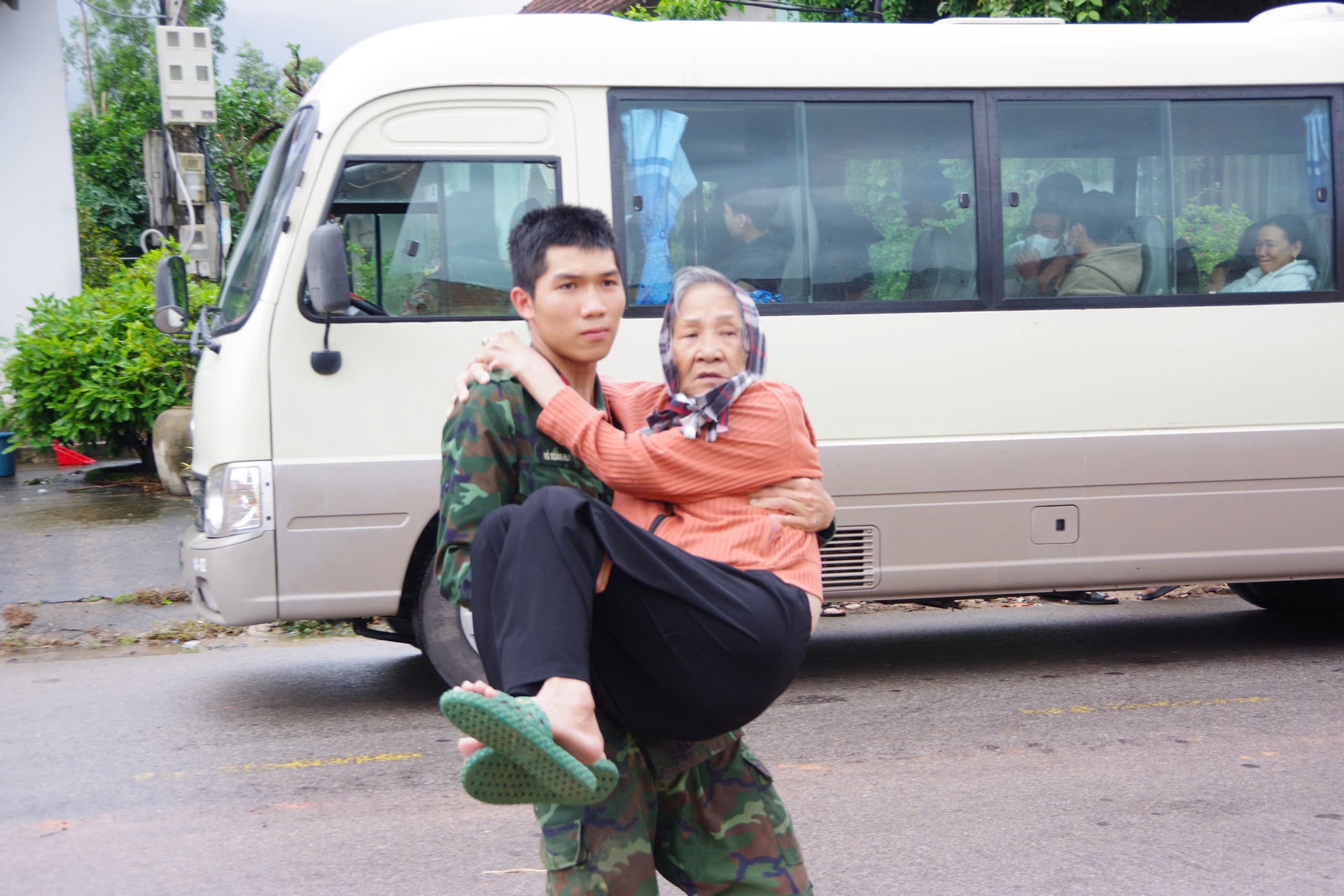 Một chiến sĩ bế cụ bà đến nơi trú bão an toàn.