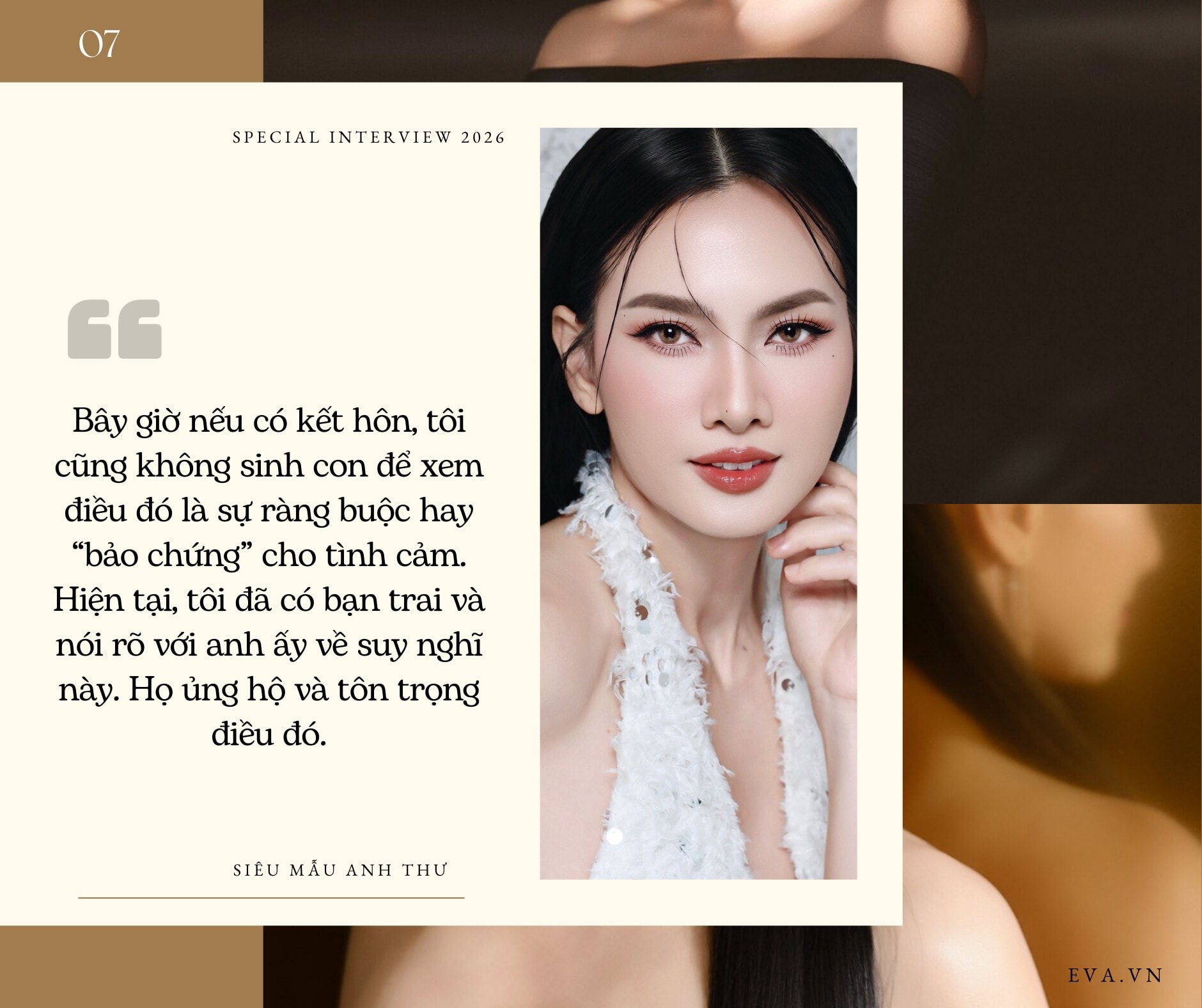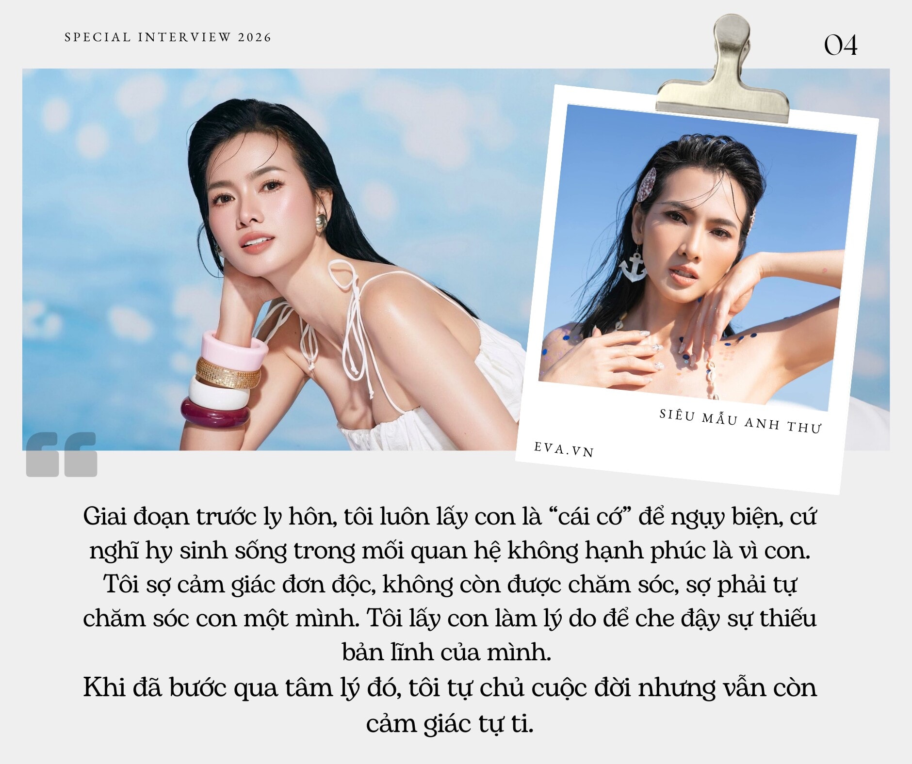 Một trong những chia sẻ đáng chú ý nhất của Anh Thư là quan điểm về sự dựa dẫm trong tình cảm. Dù là người phụ nữ tự chủ về tài chính và thời gian, chị phản đối ý kiến cho rằng phụ nữ giỏi thì không cần đàn ông. Anh Thư thừa nhận mình vẫn thích cảm giác được che chở, chăm sóc nhưng tuyệt đối không chấp nhận sự kiểm soát.