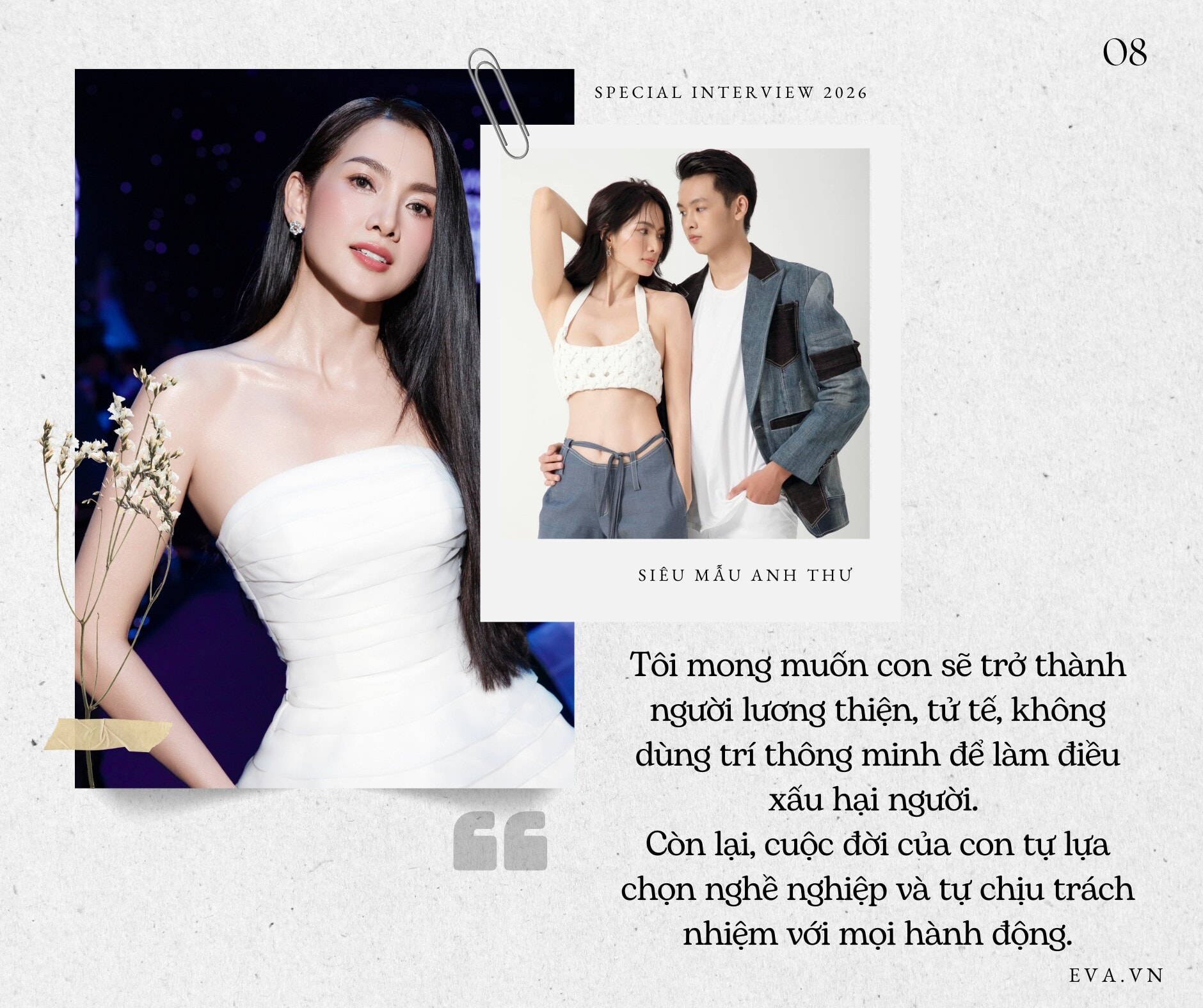 Nữ siêu mẫu không mưu cầu con trai phải trở nên quá giàu có hay thành công rực rỡ trong xã hội. Điều quan trọng nhất mà chị kỳ vọng ở Minh Khoa là trở thành một người lương thiện, tử tế và biết chịu trách nhiệm với mọi hành động của mình. Sự trưởng thành của con trai chính là niềm tự hào và là động lực lớn nhất giúp Anh Thư tận hưởng cuộc sống đủ đầy như hiện tại.