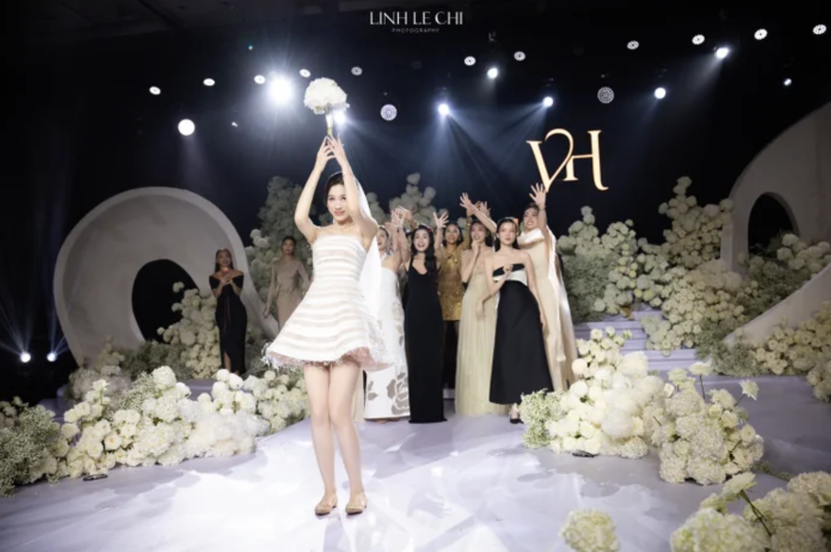Đặc biệt, người bắt được bó hoa may mắn không ai khác chính là người mẫu Hoàng Thùy. Khoảnh khắc cô vui mừng đón lấy bó hoa từ tay cô dâu nhanh chóng trở thành tâm điểm chú ý. Ảnh: FB Linh Le Chi