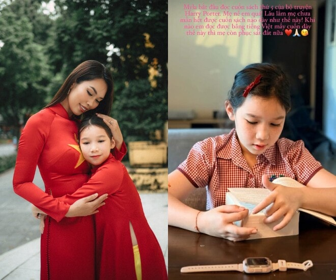 Mới đây, siêu mẫu Hà Anh đã chia sẻ khoảnh khắc ái nữ Myla đang chăm chú đọc sách, thu hút sự chú ý của người hâm mộ. Nữ siêu mẫu bày tỏ sự nể phục dành cho con gái gần 8 tuổi vì sự kiên trì khi đọc những tác phẩm có độ dày lớn. Đặc biệt, Hà Anh cũng đặt kỳ vọng vào việc con gái sẽ sớm thành thạo tiếng Việt để tiếp cận những tác phẩm văn học bằng tiếng mẹ đẻ.