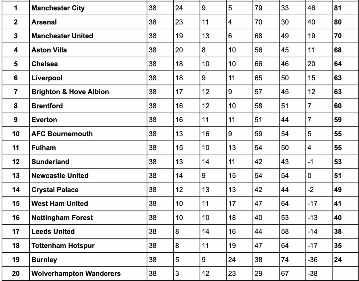 Liverpool và Chelsea đang cạnh tranh vị trí thứ năm, trong đó The Blues được đánh giá cao hơn hẳn khi giành được suất cuối cùng tham dự Champions League. Đội bóng vùng Merseyside kết thúc mùa giải ở vị trí thứ sáu, một sự tụt hạng đáng kể so với mùa giải vô địch năm ngoái, và điều này có thể khiến HLV Arne Slot phải đối mặt với nguy cơ mất việc.