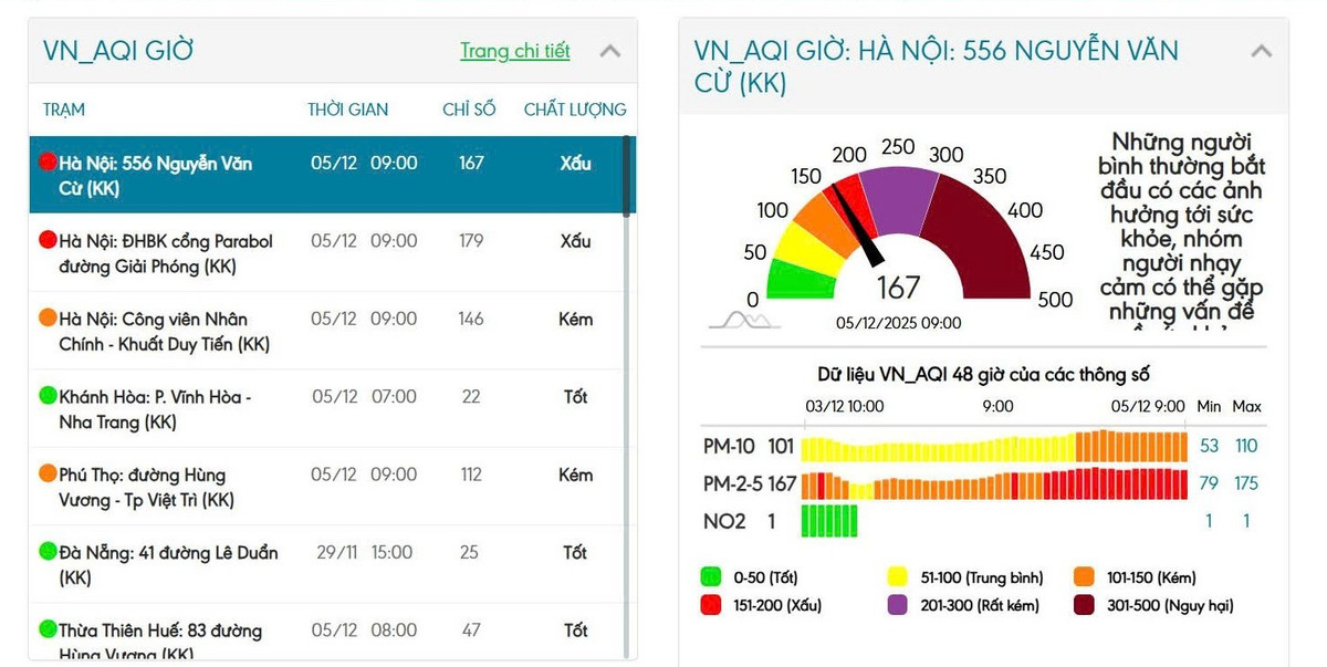 Theo hệ thống quan trắc của Trung tâm quan trắc môi trường miền Bắc - Cục Môi trường (Bộ Nông nghiệp và Môi trường), 9h30 sáng nay, tại trạm đo ở cổng Đại học Bách khoa Hà Nội trên đường Giải Phóng, chỉ số AQI là 179 - mức xấu - những người bình thường bắt đầu có các ảnh hưởng tới sức khỏe, nhóm người nhạy cảm có thể gặp những vấn đề về sức khỏe; Tại trạm 556 Nguyễn Văn Cừ lúc 9h30 sáng nay, chỉ số AQI vẫn ở mức cao là 167 - mức xấu; Trạm đo Công viên Nhân Chính - Khuất Duy Tiến, có chỉ số chất lượng không khí ở mức kém, nhưng chỉ số AQI vẫn ở mức cao là 146 - mức kém.