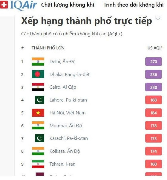 Còn theo ứng dụng IQAir theo dõi chất lượng không khí toàn cầu, Hà Nội đang xếp thứ 5 trong 10 thành phố ô nhiễm nhất thế giới, với chỉ số AQI là 184 - mức ảnh hưởng xấu tới sức khỏe.