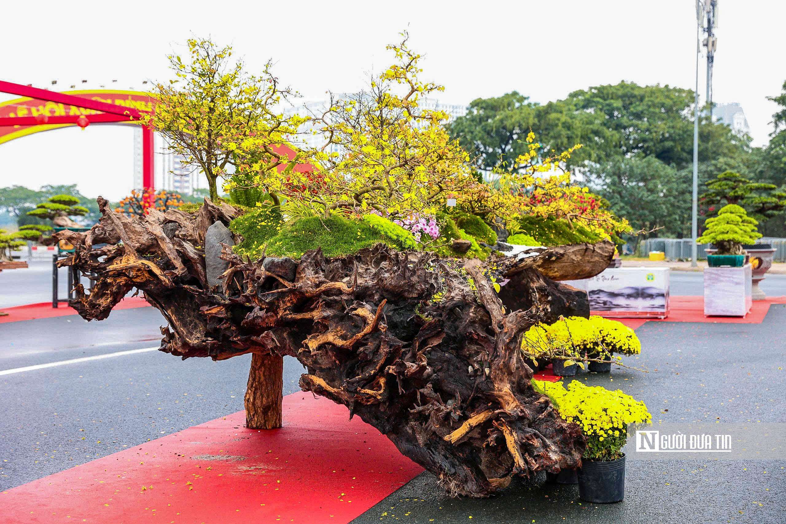 Tác phẩm Vạn lộc nghinh xuân là tổ hợp gồm 19 cây mai vàng được trồng khéo léo trên thân gỗ sao đen dài hơn 4m, tạo hình như con thuyền độc mộc chở sắc xuân đang trở thành tâm điểm thu hút tại chợ hoa Tết 2026 khu vực Mỹ Đình.