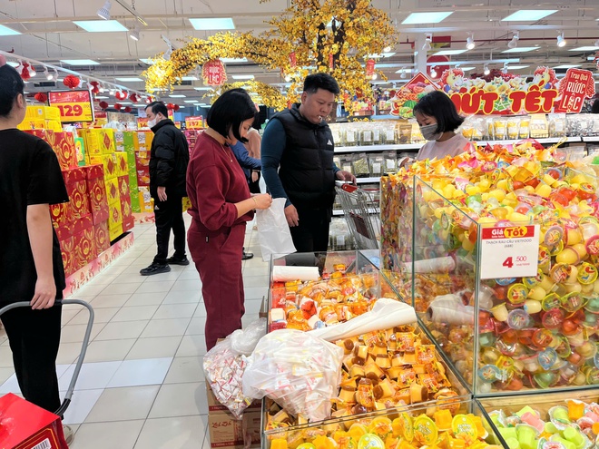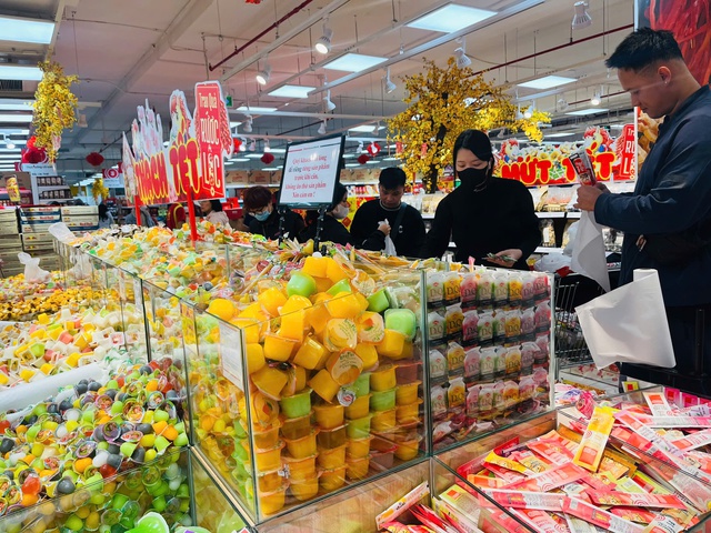 Khu vực bánh kẹo được bày bán đa dạng chủng loại, từ mứt, hạt dinh dưỡng đến bánh hộp, thu hút đông đảo khách hàng lựa chọn.