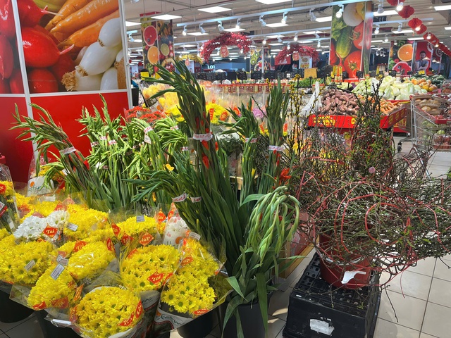 Hoa tươi, cành đào và các loại cây trang trí được bày bán rực rỡ tại siêu thị, phục vụ nhu cầu mua sắm Tết của người dân.