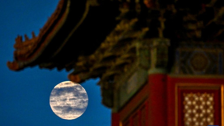 Trăng tròn được chụp gần Bảo tàng Cố cung ở thủ đô Bắc Kinh, Trung Quốc, ngày 6/10/2025. (Ảnh: Xinhua)