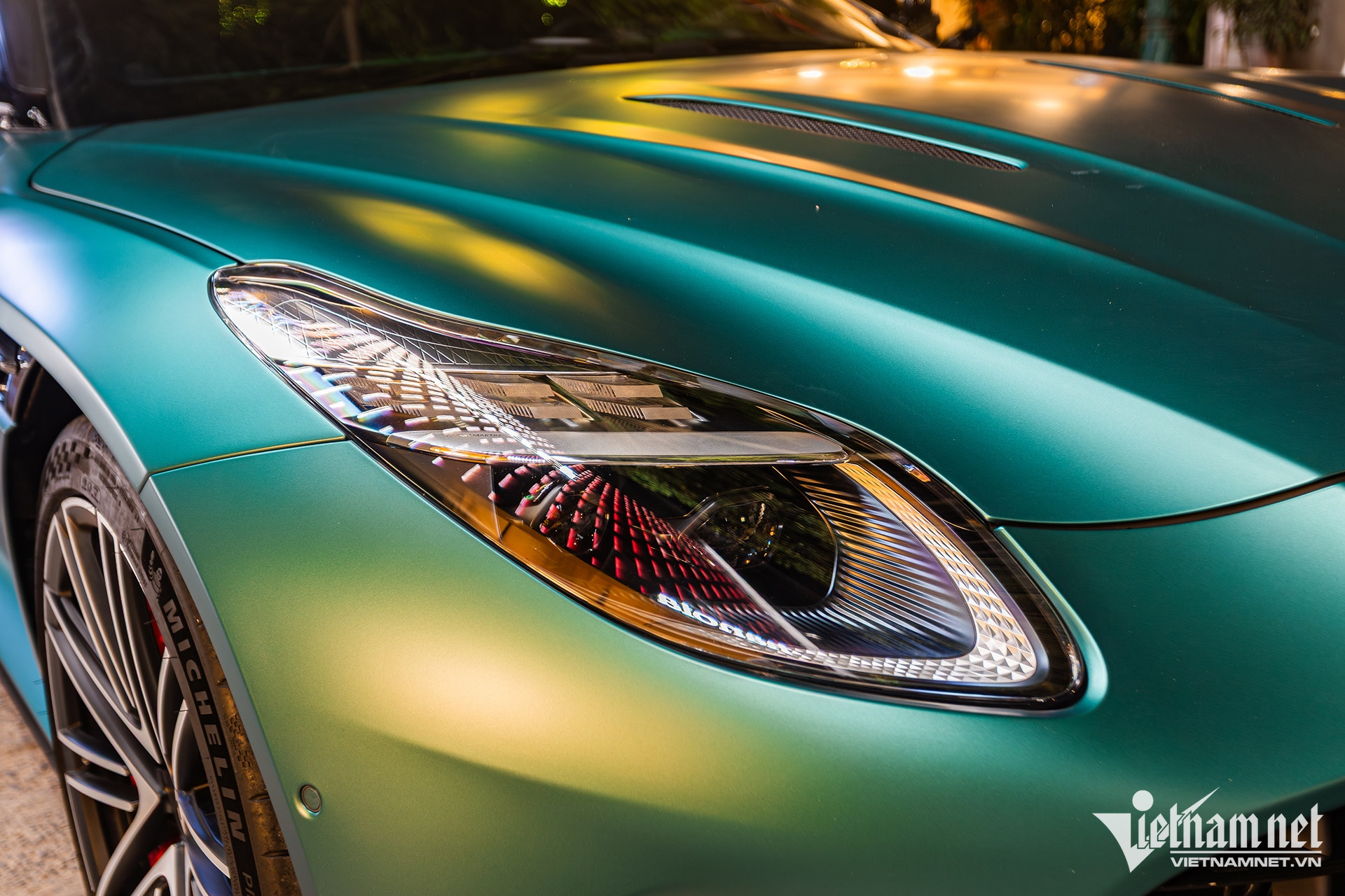 Về ngoại thất, xe được chủ nhân chọn màu sơn xanh dương với bề mặt nhám, có tên gọi Q Satin Aston Martin Racing Green. Tham khảo tại thị trường châu Âu, một số xe mang màu sơn Q Satin có giá không dưới 10.000 USD (khoảng 261 triệu đồng). Đây cũng là chiếc Aston Martin hiếm hoi tại Việt Nam mang màu sơn này.