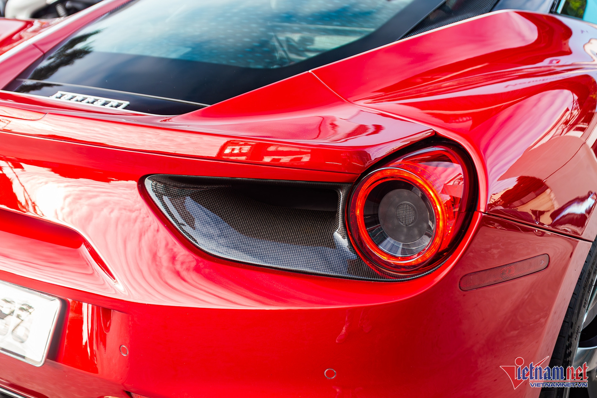 Cụm đèn chiếu sáng và đèn hậu một bên từng bị vỡ nát, do đó chủ xe phải thay mới toàn bộ. Theo tham khảo từ thị trường Mỹ, giá một cặp đèn Ferrari 488 chính hãng khoảng 25.000 USD, tương đương khoảng 650 triệu đồng. Ốp hốc đèn bằng sợi carbon nhiều khả năng được giữ nguyên, do không bị hư hỏng sau vụ va chạm.