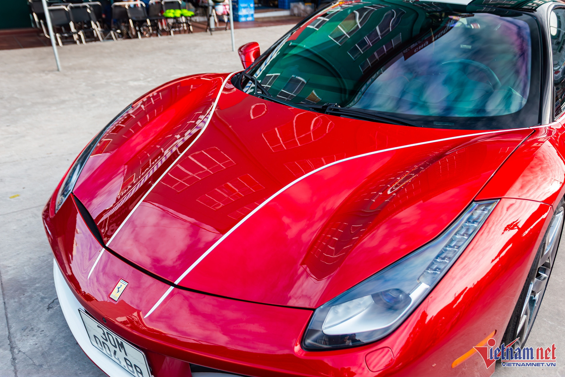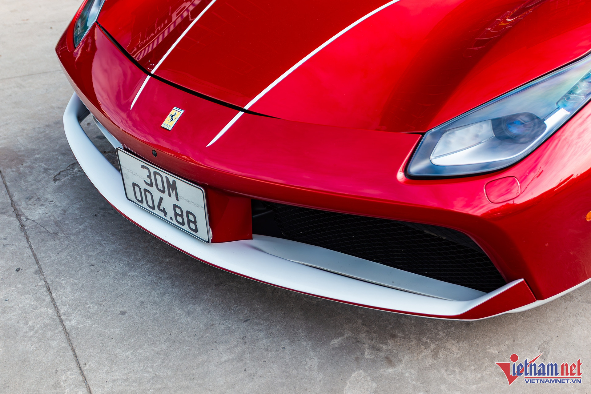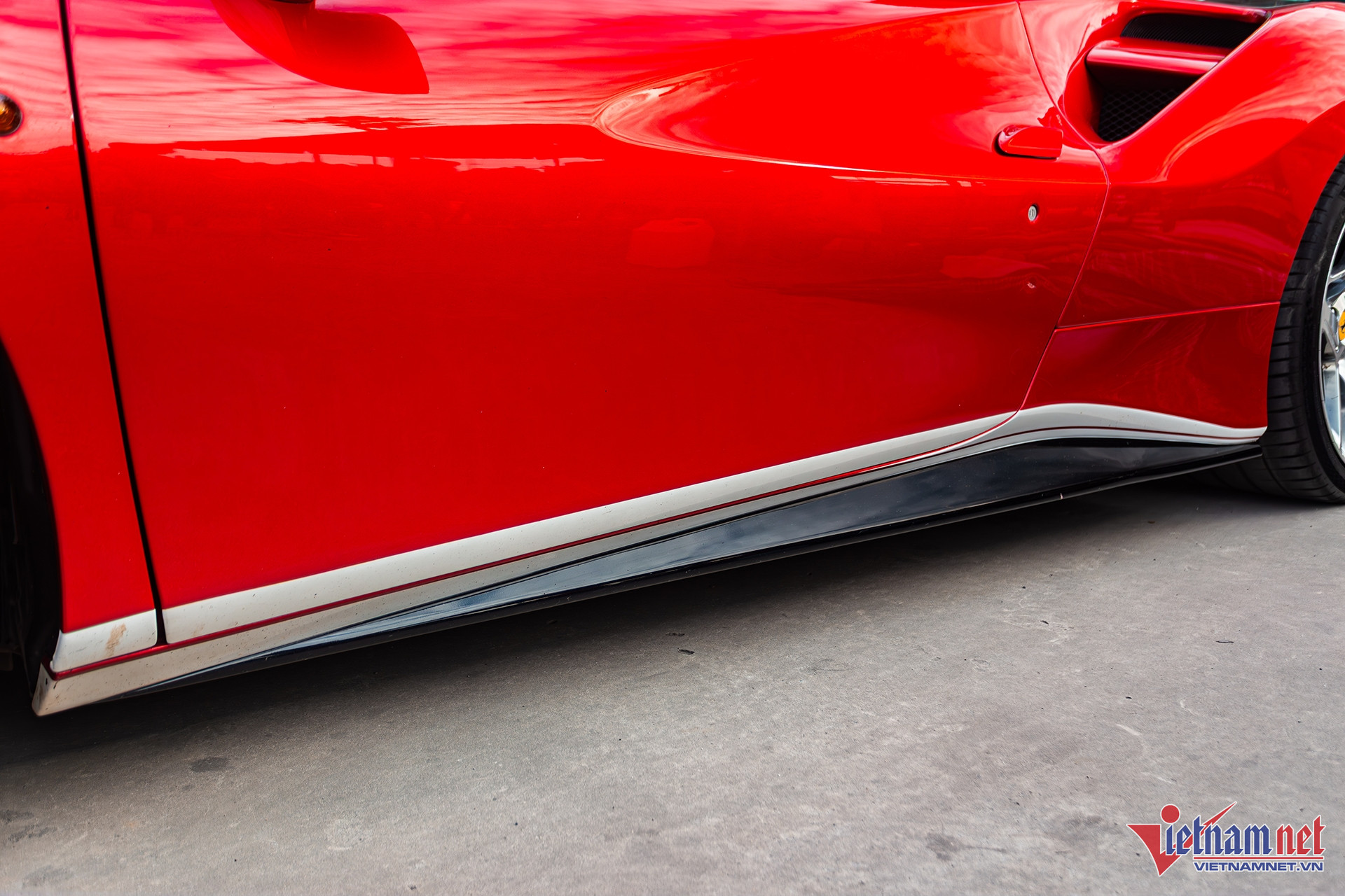 Để tạo điểm nhấn cho xe, chủ nhân chiếc Ferrari đã sơn líp cản trước màu trắng. Ngoài ra, nắp ca-pô sơn hai đường viền màu trắng chạy dọc đến khoang động cơ phía sau. Hai bên thân xe cũng sơn đường viền màu trắng, kéo dài đến phía đuôi xe.
