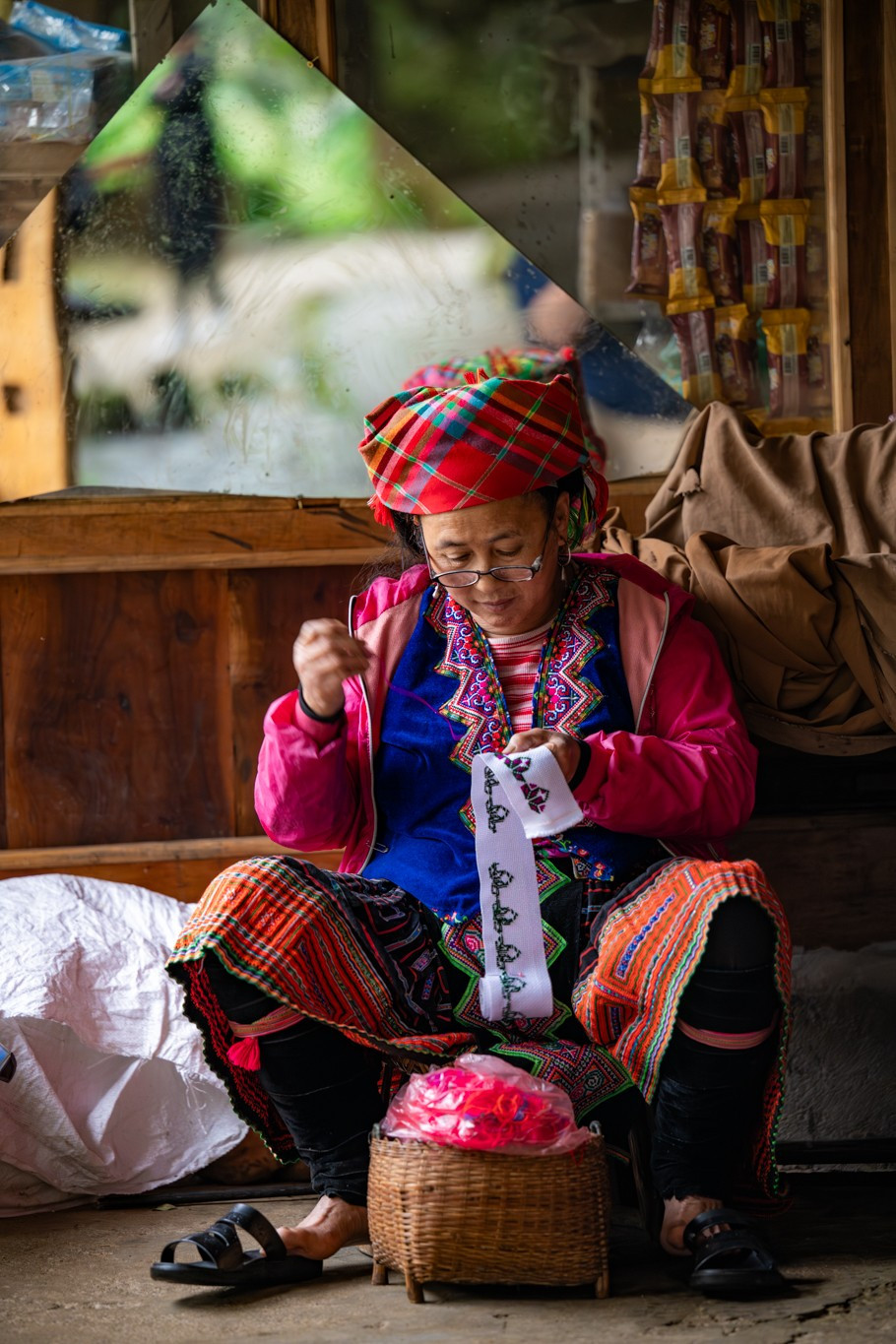 Hình ảnh các cụ già cần mẫn từng đường kim mũi chỉ dưới những mái hiên nhà cổ không phải hiếm gặp tại bản Sin Suối Hồ. (Ảnh: Minh Sơn/Vietnam+)