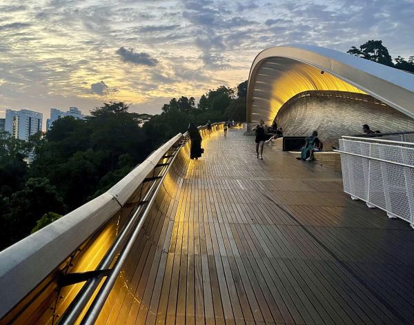Chiều tối đó, tôi dành thời gian đến một địa điểm mà nhất định phải ghé: cây cầu gỗ Henderson Waves. Cầu được dựng với khung thép và sàn gỗ, cao 36 m so với mặt đường bên dưới. Thiết kế uốn lượn như những con sóng tạo nên ấn tượng mạnh mẽ và độc đáo. Với chiều dài 274 m, Henderson Waves nối hai ngọn đồi Telok Blangah Hill và Mount Faber, trở thành điểm nhấn kiến trúc nổi bật giữa vành đai xanh mướt phía nam Singapore.