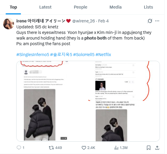 Trong thời điểm đang chiếu Single's Inferno 5, một bài đăng trên diễn đàn mạng Hàn Quốc được chia sẻ lại trên X, hút cả triệu lượt tương tác. K-net nói rằng họ đã thấy Min Gee và Hyun Jae nắm tay nhau trên đường. Người hâm mộ “đẩy thuyền”, liên hệ chi tiết anh từng tặng socola vàng cho cô trong show hay việc cô cổ vũ anh ở các thử thách thể lực.