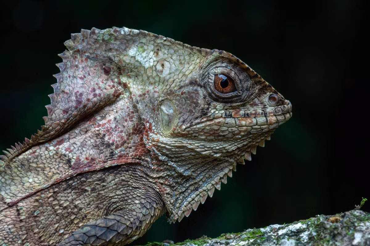 Tuy nhiên, điều khiến cự đà mũ trở nên đặc biệt không chỉ nằm ở ngoại hình. Nó là một trong những bậc thầy ngụy trang đáng kinh ngạc của tự nhiên. Khi đứng yên trên cành cây, cơ thể màu nâu xám với những vệt hoa văn bất định giúp nó gần như “tan biến” vào nền rừng. Đặc biệt hơn, loài này có thể bất động trong thời gian dài – đôi khi hàng giờ liền – để tránh sự chú ý của kẻ săn mồi cũng như con mồi. Chính chiến thuật “đóng băng” này khiến nhiều người dễ nhầm tưởng nó chỉ là một mảnh vỏ cây khô.