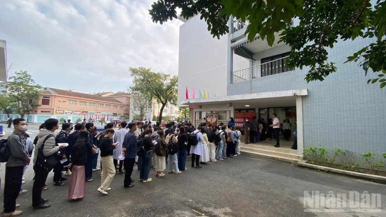 Tại điểm bầu cử này, sinh viên ngành y xếp hàng ngay ngắn chờ đến lượt. Nhiều giảng viên cũng tranh thủ hoàn thành việc bỏ phiếu sớm trước khi bắt đầu công việc chuyên môn tại bệnh viện.