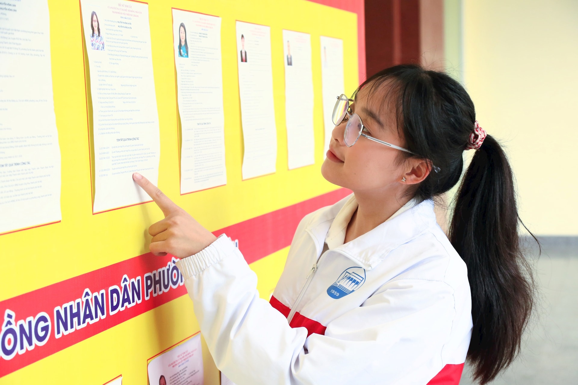 Sinh viên Lê Thị Hồng Nhung chăm chú đọc tiểu sử tóm tắt của các ứng cử viên. Ảnh: Tuyết Linh