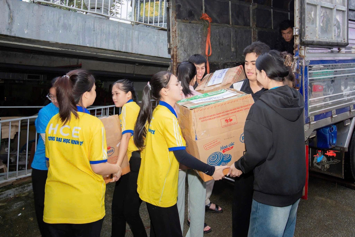 Sinh viên khẩn trương đưa từng thùng hàng lên xe tải cứu trợ.