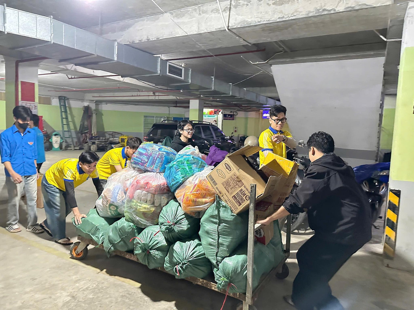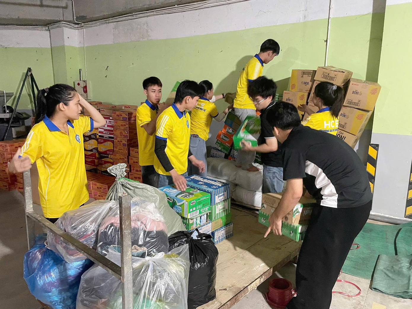 Không khí khẩn trương bao trùm ở điểm tập kết khi các bạn sinh viên nhanh chóng di chuyển hàng cứu trợ.