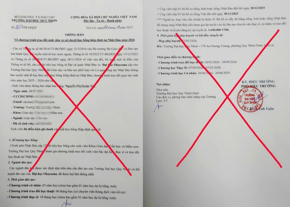 Theo TS Tuấn, thông báo có nội dung “chương trình trao đổi sinh viên và học bổng hiệp định Nhật Bản năm 2026” ghi ngày 22-12-2025 có tên và chữ ký “TS Đinh Anh Tuấn- Phó Phó Hiệu trưởng Trường Đại học Quy Nhơn” là thông báo giả mạo, sai sự thật.