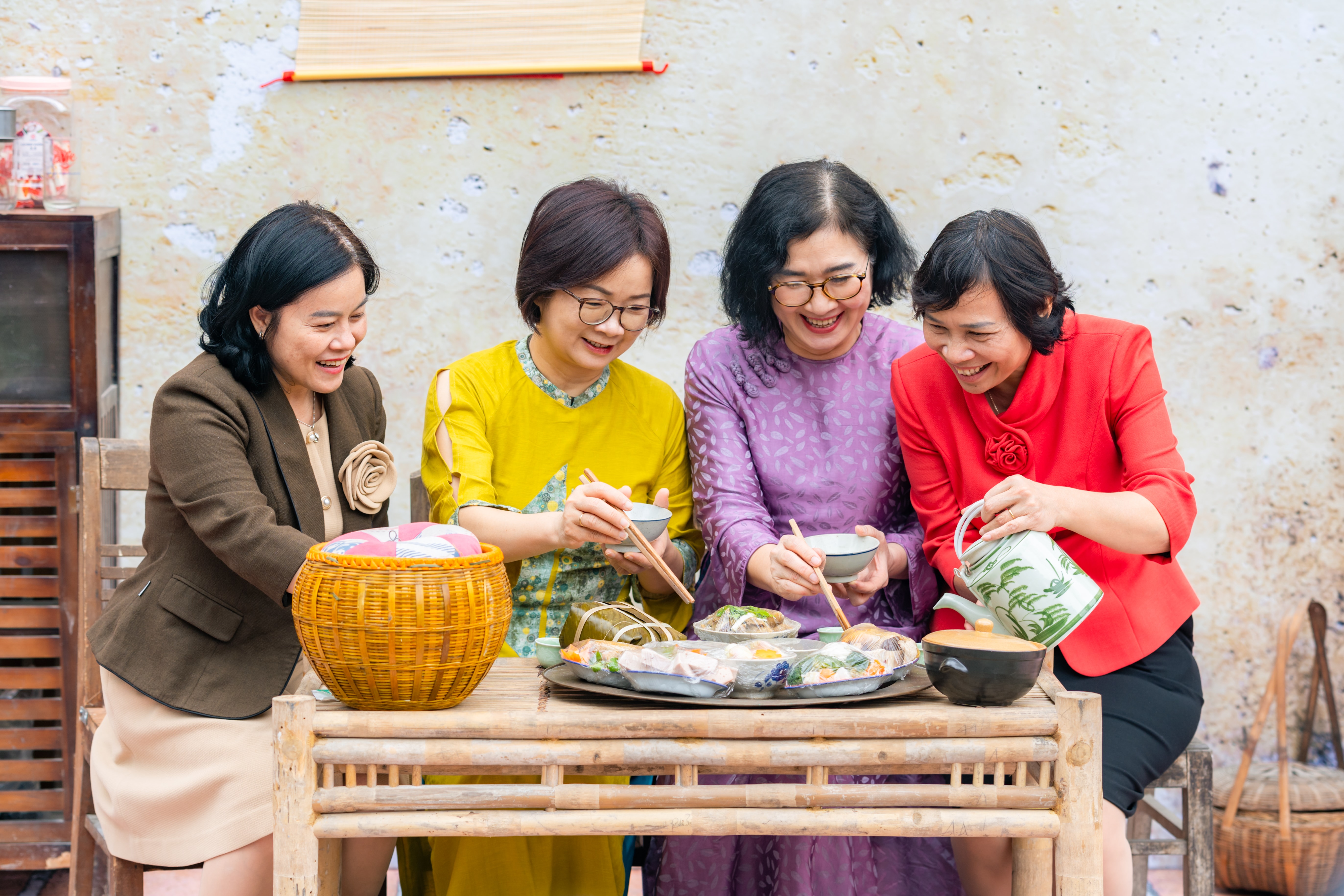 Các giảng viên Trường Đại học Ngoại Thương quây quần bên mâm cơm Tết.