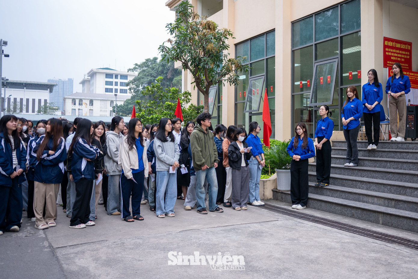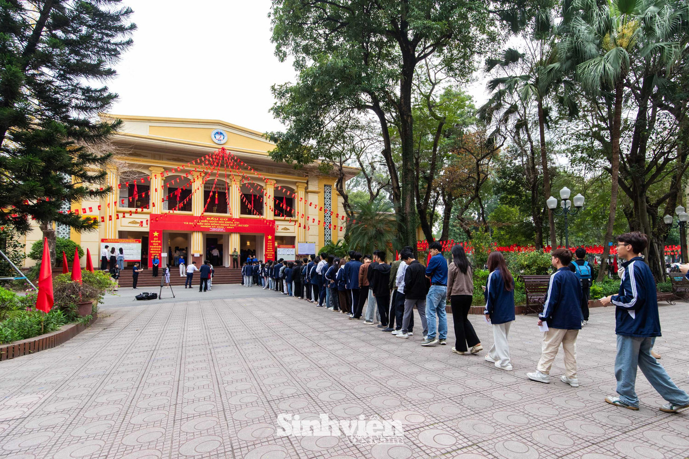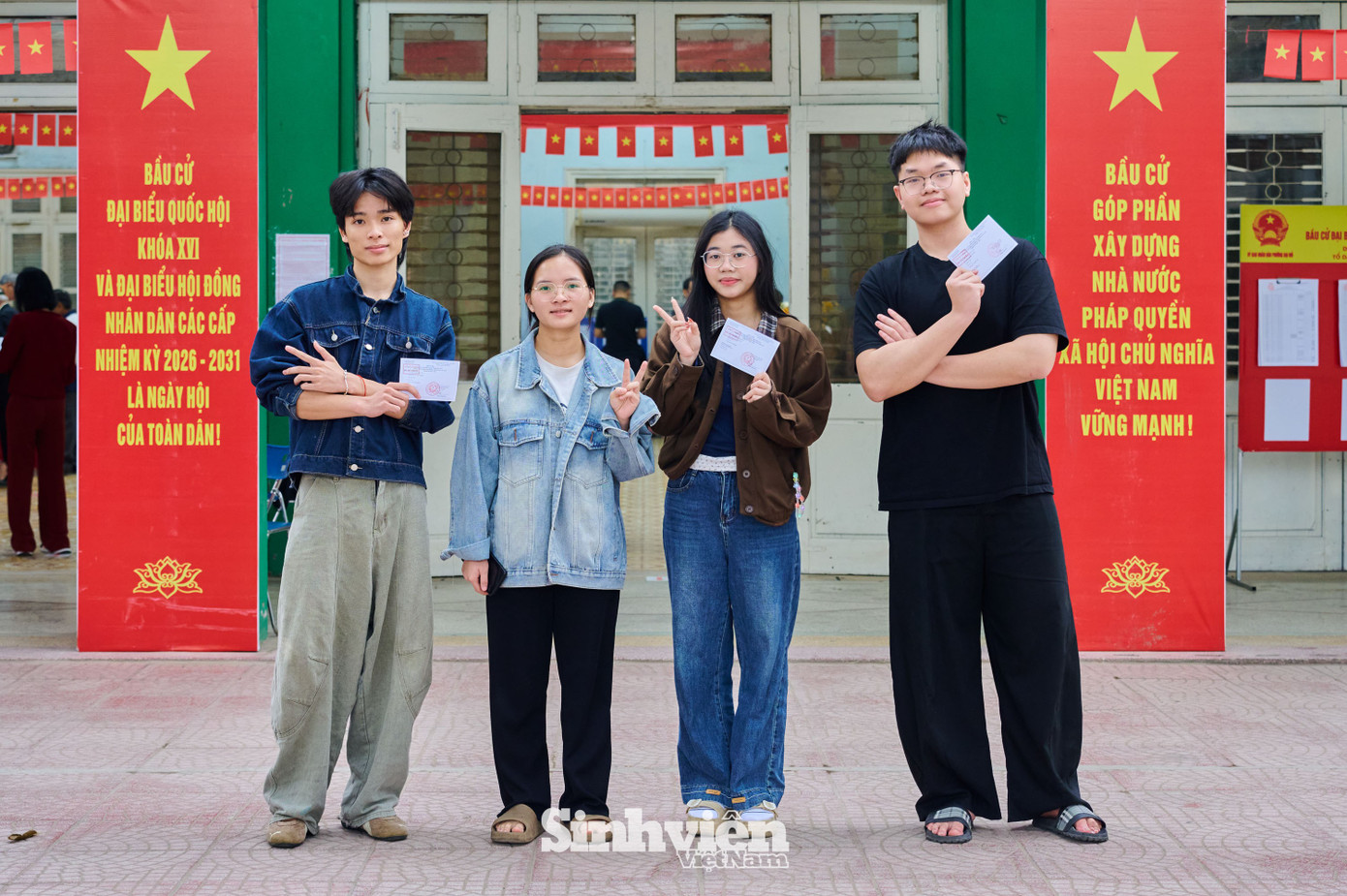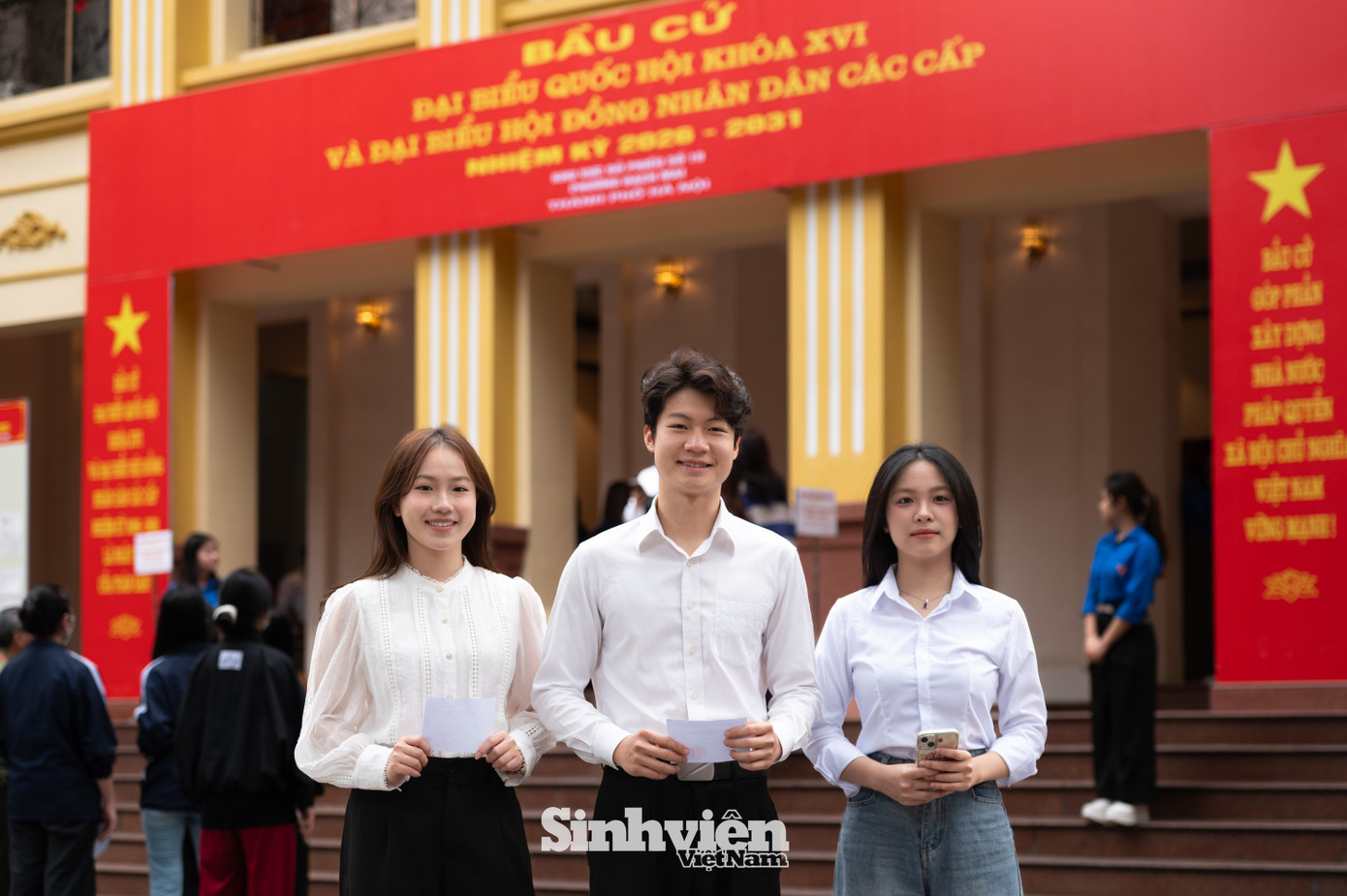 Tại Trường Đại học Hà Nội, đông đảo sinh viên đã nô nức có mặt từ sáng sớm. Điểm bầu cử được trang hoàng rực rỡ không chỉ là nơi bỏ phiếu mà còn trở thành góc "check-in" rộn ràng của thầy và trò trong sự kiện trọng đại của đất nước.