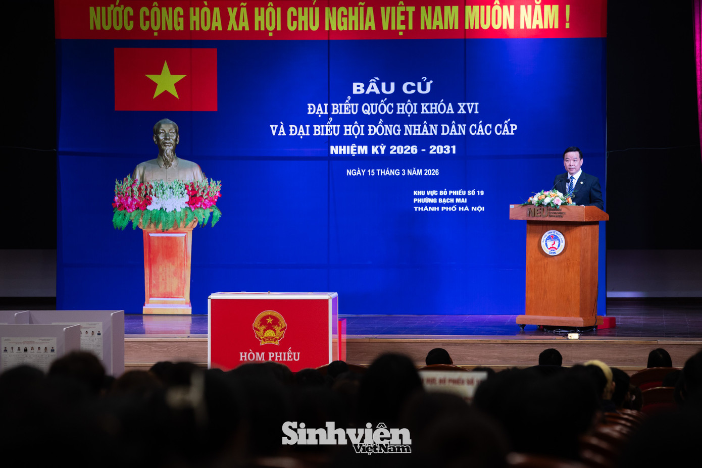 Tại Khu vực bỏ phiếu số 19 (phường Bạch Mai) đặt tại Đại học Kinh tế Quốc dân, Lễ khai mạc đã diễn ra trang trọng với nghi thức chào cờ thiêng liêng. Phát biểu khai mạc tại điểm bầu cử, PGS.TS Bùi Huy Nhượng - Giám đốc Đại học Kinh tế Quốc dân, Tổ trưởng Tổ bầu cử số 19 nhấn mạnh: "Cuộc bầu cử đại biểu Quốc hội khóa XVI và đại biểu HĐND các cấp nhiệm kỳ 2026-2031 là sự kiện chính trị có ý nghĩa đặc biệt quan trọng. Chúng tôi kêu gọi toàn thể cử tri phát huy đầy đủ quyền và nghĩa vụ công dân, sáng suốt lựa chọn ra những đại biểu có đức, có tài, đại diện cho ý chí và nguyện vọng của Nhân dân".