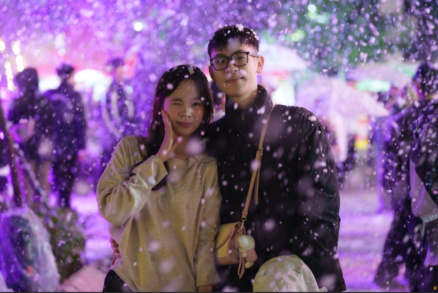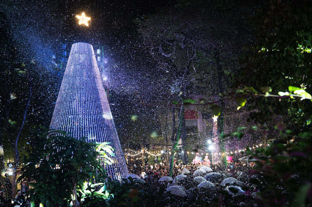 Không chỉ có tuyết rơi trên cây thông khổng lồ duy nhất tại Hà Nội, trường còn tổ chức bắn pháo hoa, các gian hàng ẩm thực và đồ lưu niệm Giáng sinh.