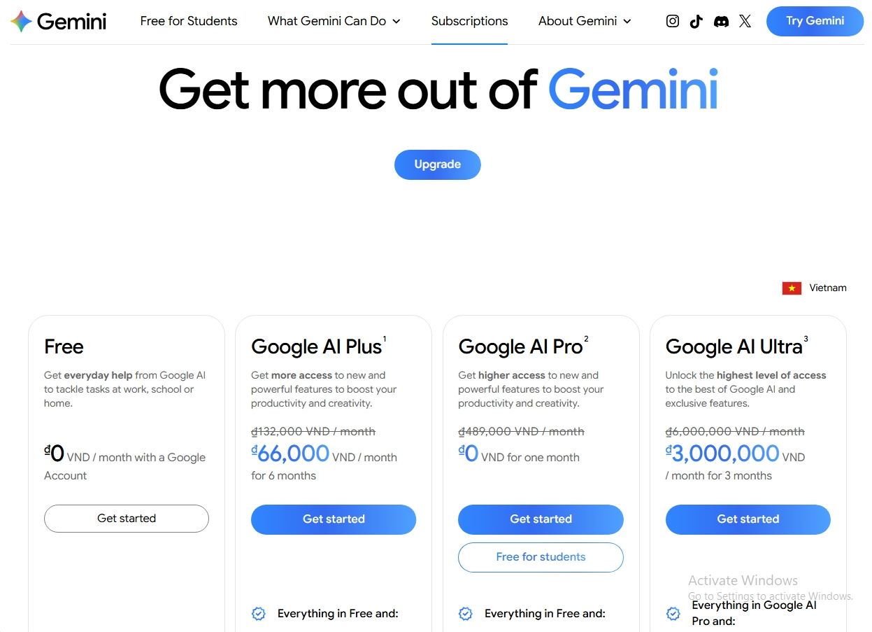 Các gói Google AI đang cung cấp tại Việt Nam. Ảnh chụp màn hình.