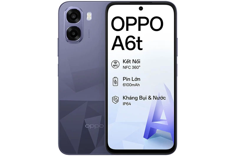 Oppo A6t sở hữu mặt lưng lấy cảm hứng từ pha lê với hiệu ứng ánh sáng tinh tế, mang đến cảm giác trẻ trung và hiện đại. Sản phẩm có hai tùy chọn màu sắc là tím và xanh. Phiên bản màu tím mang phong cách nhẹ nhàng, thời trang, phù hợp với người dùng yêu thích sự tinh tế, trong khi phiên bản xanh thể hiện nét năng động, trẻ trung, dễ dàng kết hợp với nhiều phong cách khác nhau.