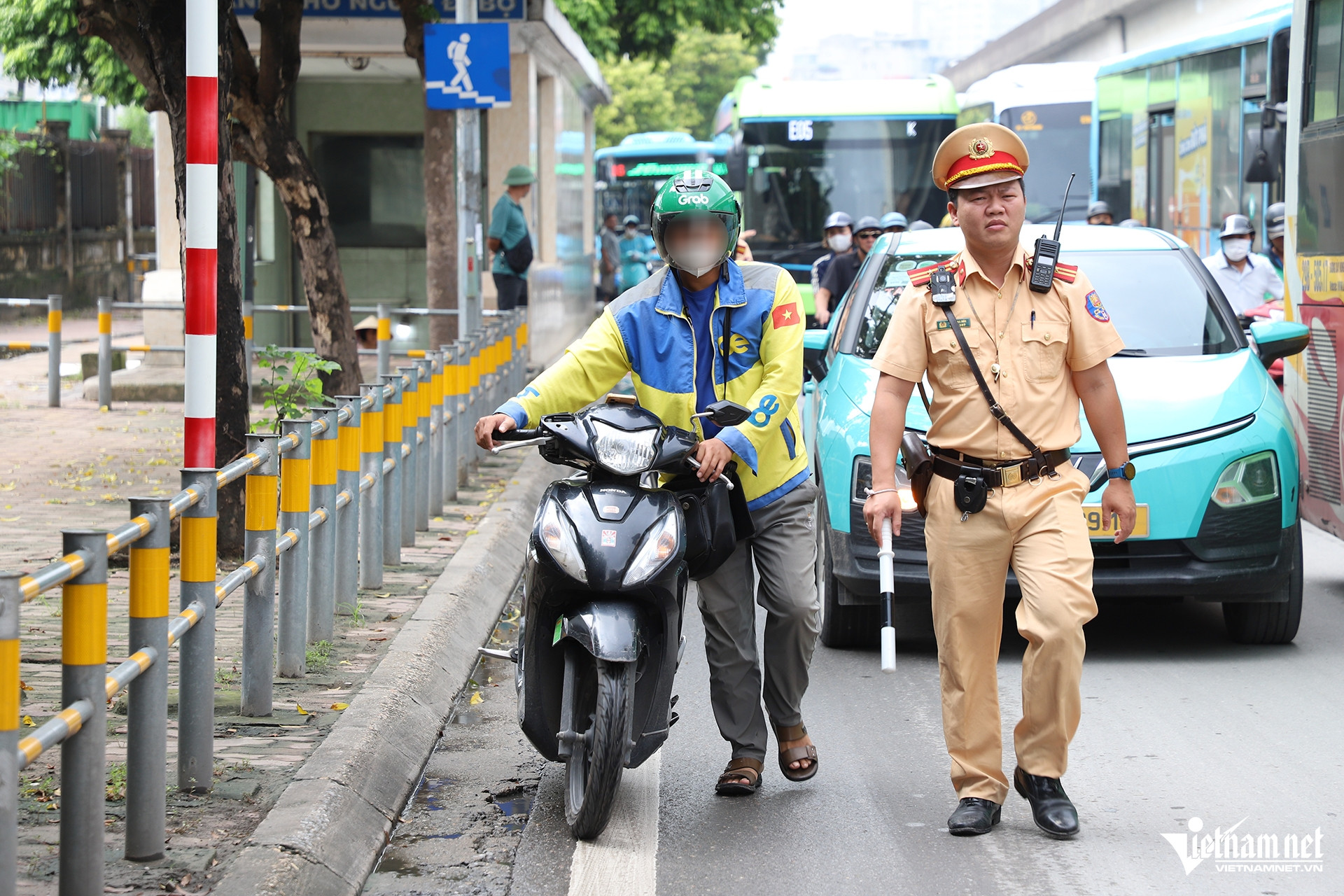 Ghi nhận của PV VietNamNet tại đường Phạm Hùng (đoạn qua Bến xe Mỹ Đình), tổ CSGT đi mô tô tuần tra liên tiếp phát hiện các trường hợp tài xế xe máy vi phạm.