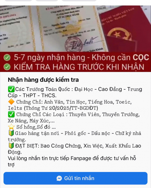 Hoạt động này còn được “tiếp sức” bởi mạng xã hội, nơi các tài khoản và fanpage liên tục mọc lên, vận hành như một dịch vụ khép kín. Chỉ cần vài tin nhắn và một khoản chuyển tiền, giấy tờ giả có thể được giao tận tay, khiến rủi ro lan rộng và ngày càng khó kiểm soát.