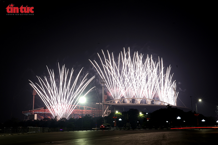 Những chùm pháo hoa tầm cao bung nở trên bầu trời Mỹ Đình.