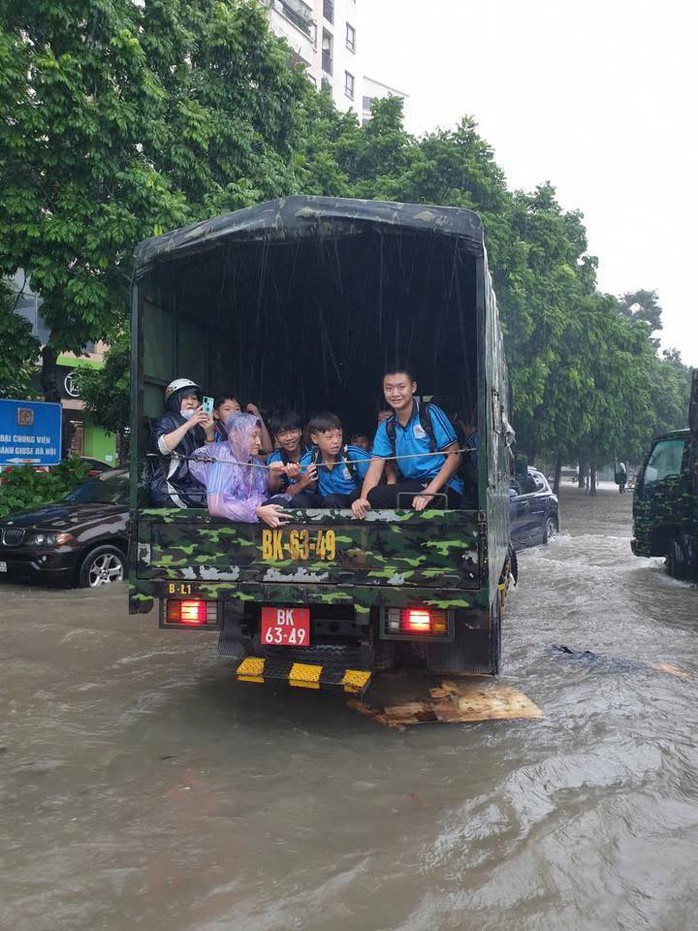 Trường THCS Cổ Nhuế 2 (Hà Nội) liên hệ, đặt vấn đề và được đơn vị quân đội đồng ý điều 4 xe chuyên dụng đến đưa học sinh từ trường tới điểm tập kết cao, khô ráo cách trường 200-500 m để phụ huynh đến đón con em về vào trưa ngày 30-9. Ảnh: OFFB
