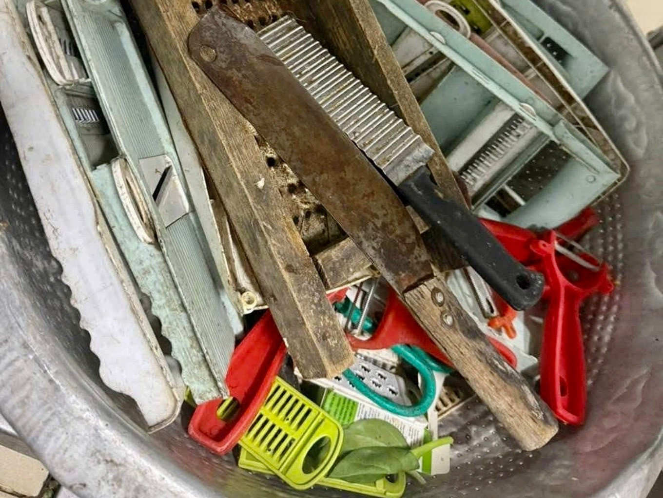 Ngoài thịt ôi, trứng cút bốc mùi, phụ huynh Trường tiểu học Cự Khê còn phát hiện dụng cụ chế biến thực phẩm bếp ăn của trường này không đảm bảo an toàn vệ sinh thực phẩm. (ảnh: Phụ huynh cung cấp)