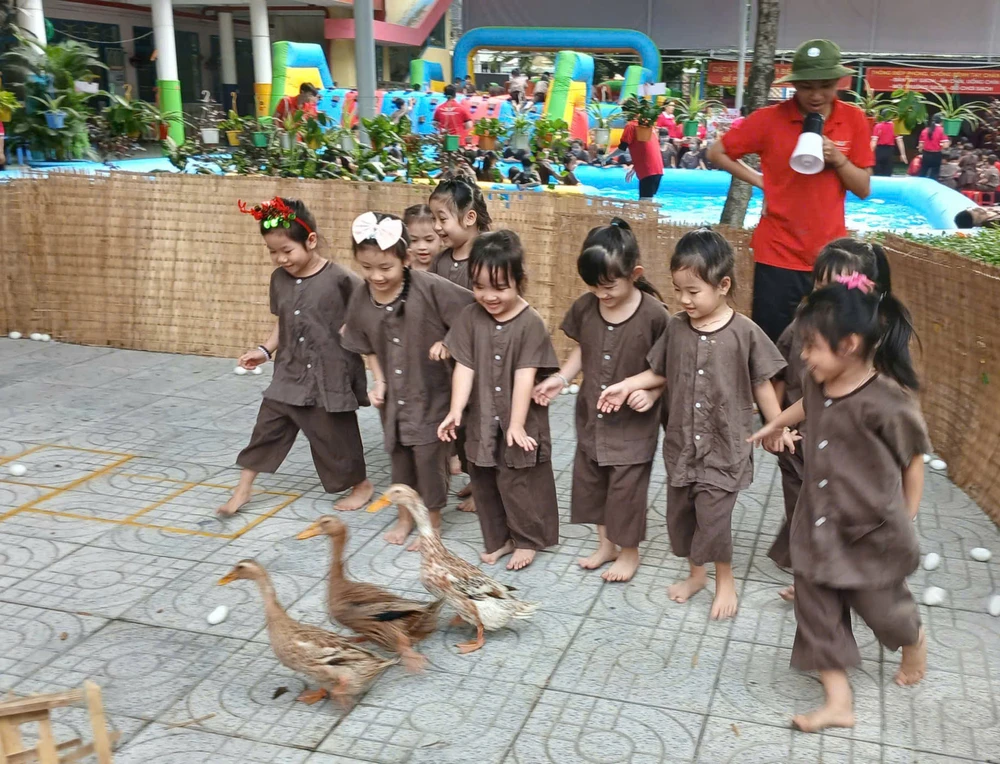 Trường Mầm non Sơn ca 5, phường Trung Mỹ Tây tổ chức hoạt động ngoại khóa tại sân trường với nhiều trò chơi hấp dẫn để trẻ trải nghiệm. Ảnh: NTCC