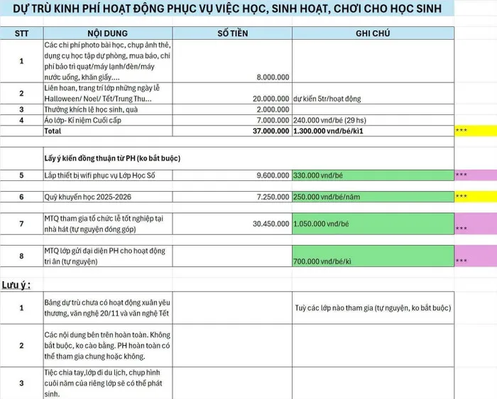 Báo cáo nêu, ban đại diện cha mẹ học sinh lớp 5/2 Trường Tiểu học Lê Ngọc Hân đã đưa ra bảng dự kiến các nội dung thu - chi trong năm, trong đó phát sinh nội dung "trang bị lắp đặt hệ thống mạng cho lớp".