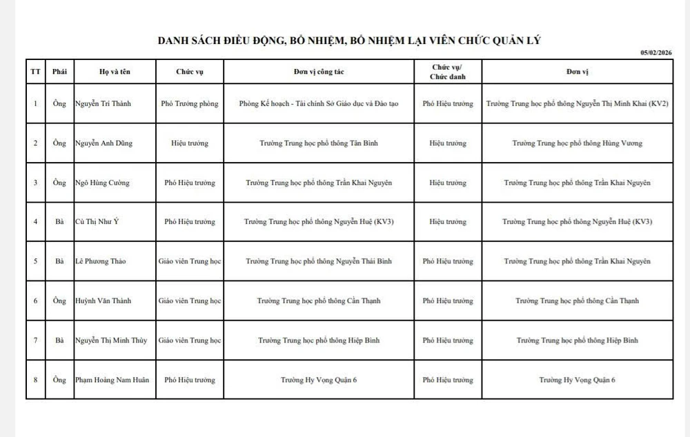 Theo đó, ông Nguyễn Trí Thành, Phó trưởng Phòng Kế hoạch - Tài chính thuộc Sở GD&ĐT, được bổ nhiệm làm Phó Hiệu trưởng Trường THPT Nguyễn Thị Minh Khai (khu vực 2).