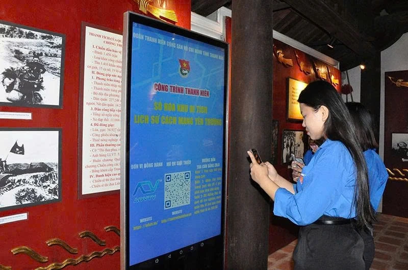 Đoàn viên thanh niên quét mã QR để tìm hiểu về Khu Di tích lịch sử cách mạng Yên Trường (xã Thọ Lập).