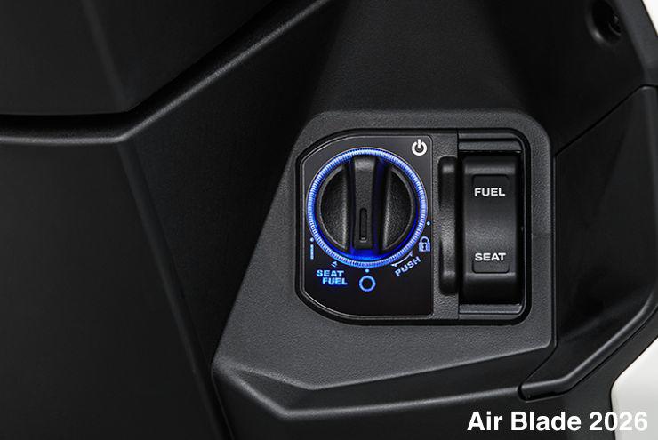 Thế hệ Air Blade 2026 vẫn dùng chìa khóa thông minh như Air Blade 2025 với đầy đủ các chức năng mở nắp bình xăng, mở cốp. Nắp bình xăng vẫn được đặt tại gờ trung tâm của sàn để chân đem tới thuận tiện khi tiếp nhiên liệu.