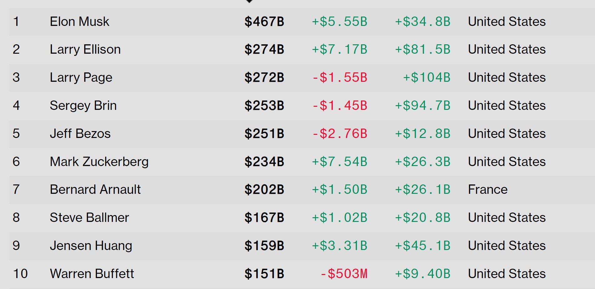 Tổng giá trị tài sản ròng của 2.919 tỷ phú đạt 15.800 tỉ USD, tăng 13% so với năm ngoái, chủ yếu nhờ sự tăng trưởng mạnh mẽ của cổ phiếu công nghệ nhờ AI (trí tuệ nhân tạo). Riêng Magnificent Seven đã chứng kiến giá cổ phiếu của họ tăng tổng cộng 25% trong năm nay.