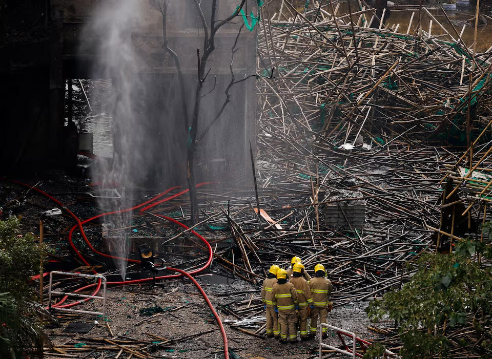 Lính cứu hỏa tập trung bên dưới đống đổ nát của giàn giáo tre tại khu nhà ở Wang Fuk Court sau vụ hỏa hoạn chết người ở Tai Po, Hồng Kông, Trung Quốc. Nguồn: Reuters.