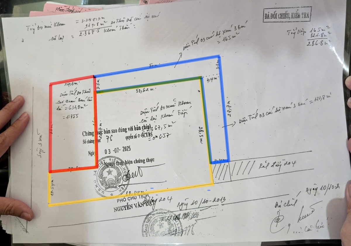 Một tài liệu quan trọng mà bà Ngát vẫn còn giữ là sơ đồ khu Ao Mũi Khoan năm 2013, có chữ ký của cán bộ, lãnh đạo xã bấy giờ. Sơ đồ thể hiện rõ ranh giới 3 phần đất: 631,8 m2 do thôn bán lâu dài; 288 m2 đất 03 của các hộ dân bán; 2.367,5 m2: đất khoán tiếp.