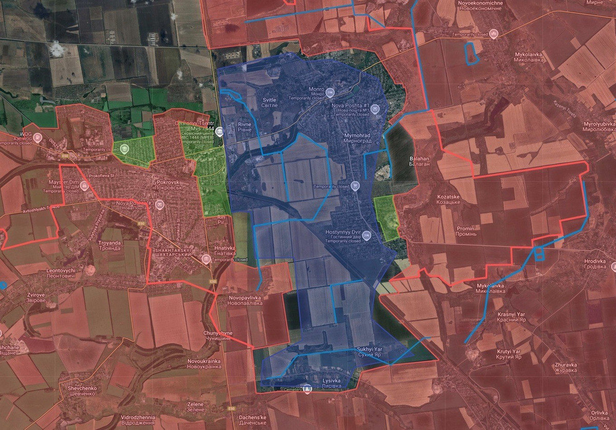 “Chúng tôi đã mất quyền kiểm soát 80% thành phố và đang chiến đấu cho 20% còn lại, nhưng ngay cả ở đó, chúng tôi cũng gặp bất lợi. Tình hình ở Myrnohrad và khu vực phía nam còn tệ hơn khi họ có nguy cơ bị bao vây hoàn toàn", một sĩ quan cấp cao ẩn danh thừa nhận. Một binh sĩ khác đang bảo vệ Myrnohrad cũng xác nhận tình hình đang trở nên nghiêm trọng tại khu vực nằm chỉ cách Pokrovsk vài km.