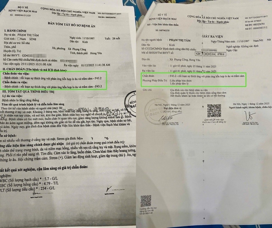Viện Sức khỏe Tâm thần - Bệnh viện Bạch Mai - chẩn đoán chị Phạm Thị Tâm mắc chứng “rối loạn thích ứng với phản ứng hỗn hợp lo âu và trầm cảm”. Ảnh: NVCC.