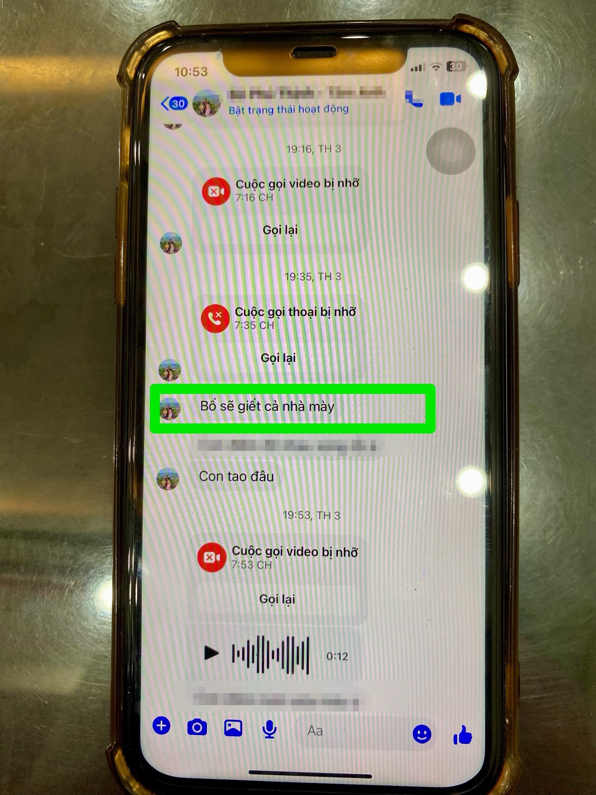 Theo chia sẻ của chị Phạm Thị Tâm, ngày 31/3/2026 và trước đó, B.N.V đã nhiều lần nhắn tin xúc phạm, đe dọa chị và gia đình. Ảnh chụp từ điện thoại chị Tâm.