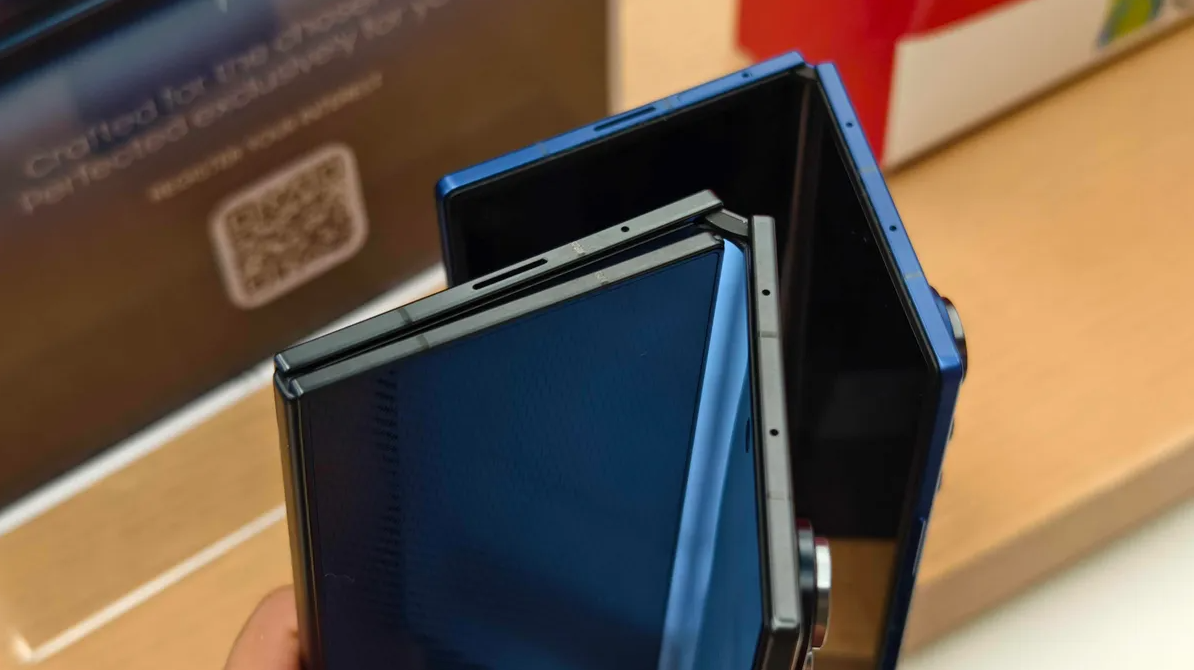 Khi cả hai điện thoại được gập lại và đặt cạnh nhau, sự khác biệt về độ dày sẽ ngay lập tức được nhận thấy. Galaxy Z Fold 7 có độ dày 8,9mm, mỏng hơn so với Galaxy Z TriFold - độ dày 12,9mm.