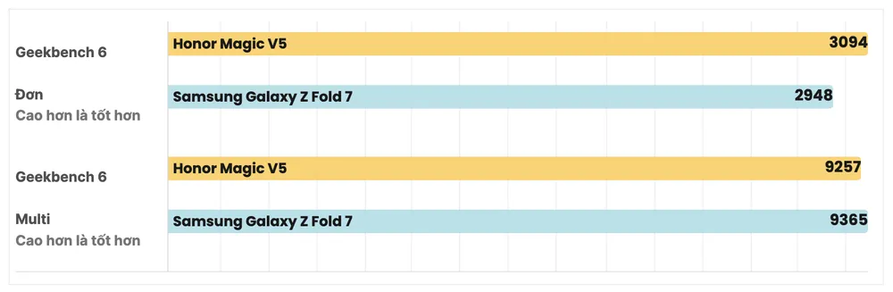 Cả Magic V5 lẫn Z Fold7 đều được trang bị Snapdragon 8 Elite. Trong các bài kiểm tra, Magic V5 ghi được điểm đơn nhân cao hơn một chút, trong khi Z Fold7 lại dẫn đầu ở bài kiểm tra đa nhân.